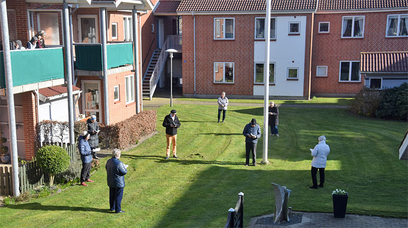 Kom og vær med til at være sammen. Vi mødes omkring flagstangen på hverdage kl. 15.30 Her vil vi synge et par sange og kan så sludre lidt som vi nu lyster. Har du det bedst med at blive inden døre kan du være med ud af dit vindue eller stå på terrassen/ altanen Vi starter med at synge efter Højskolesangbogen, har du den må du gerne tage den med.